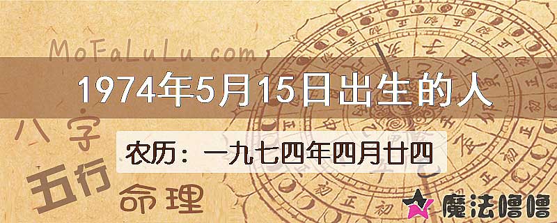 阳历1974年5月15日出生对应的农历是一九七四年四月廿四,农历1974年出生的生肖都属虎。(十二生肖顺序:鼠-牛-虎-兔-龙-蛇-马-羊-猴-鸡-狗-猪)