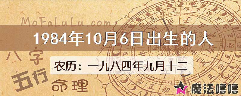 阳历1984年10月6日出生对应的农历是一九八四年九月十二,农历1984年出生的生肖都属鼠。(十二生肖顺序:鼠-牛-虎-兔-龙-蛇-马-羊-猴-鸡-狗-猪)