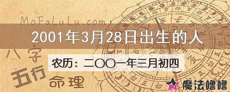 2、农历(阴历)2001年3月28日对应的新历日期是2001年4月21日,本日出生的人属于金牛座(Taurus)。金牛男浪漫、决断能力、逻辑强,而金牛女性格浪漫、决断能力、逻辑强。更详细的[金牛座]分析>